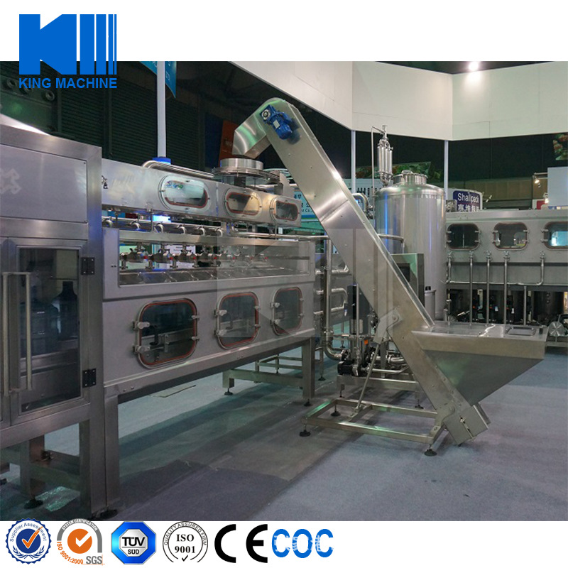 本設備集合了消毒、沖洗、灌裝和壓蓋,合四為一,能夠實現全自動桶裝水旋蓋。沖瓶機使用多種沖品液和消毒液,以保證獲得沖瓶和殺菌效果。消毒液可以循環使用,節省消耗。