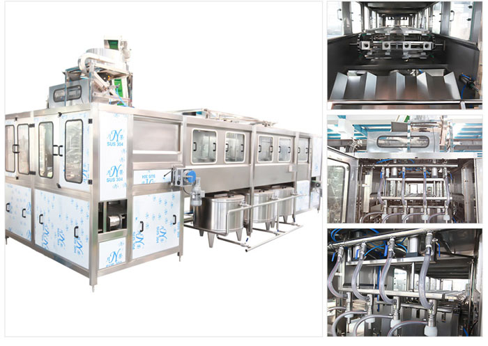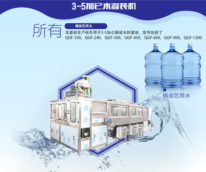 本灌裝生產(chǎn)線專用于3-5加侖桶裝水的灌裝,型號包括了QGF-100,QGF-240,QGF-300,QGF-450,QGF-600,QGF-900,QGF-1200。合沖洗、灌裝、旋蓋三為一體。沖洗機(jī)采用了多種洗液以及消毒液對瓶子進(jìn)行清洗以及消毒,消毒液能夠循環(huán)使用。瓶蓋會在清洗和消毒后運(yùn)至旋蓋機(jī)自動進(jìn)行旋蓋。本產(chǎn)品功能齊全,涵蓋了清洗、消毒、灌裝、旋蓋、計(jì)數(shù)等功能,高度自動化,實(shí)為飲料生產(chǎn)廠家理想的優(yōu)先設(shè)備。