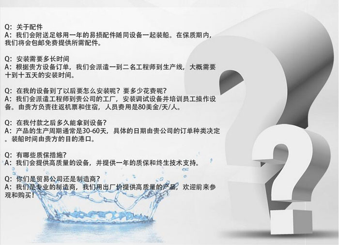 我們采用不同設(shè)備來(lái)生產(chǎn)純凈水和礦泉水。主要設(shè)備有石英砂過(guò)濾器、活性炭過(guò)濾器、鈉離子交換器、精密過(guò)濾器、反滲透過(guò)濾器、紫外線消毒機(jī)、臭氧發(fā)生器、儲(chǔ)水罐等。產(chǎn)量是0.5-50 ton/hour。該設(shè)備能夠有效去除懸浮物、有機(jī)物、重金屬離子離子、氧化物、膠體等,有效軟化水,使得產(chǎn)出的水能夠滿足飲用水的標(biāo)準(zhǔn)。